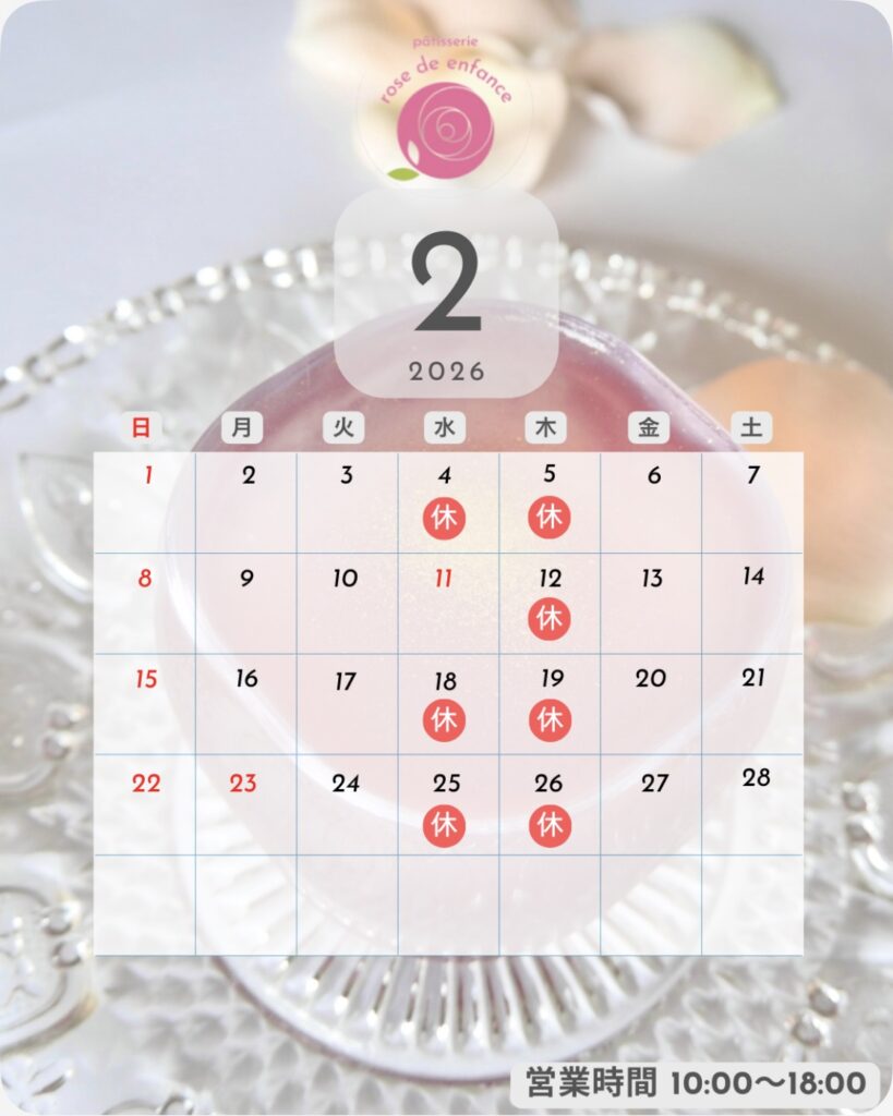 2月定休日のお知らせ 2026 2/10 2026年2月1日2026年2月10日 Screenshot お知らせ 1月定休日のお知らせ 関連記事 クリスマスケーキの予約受付スタート🎅 2025年11月12日 8月定休日 2025年8月2日 クラウドファンディングの応援メッセージを頂きました🌹 2024年9月22日 Hello world! 2023年6月15日