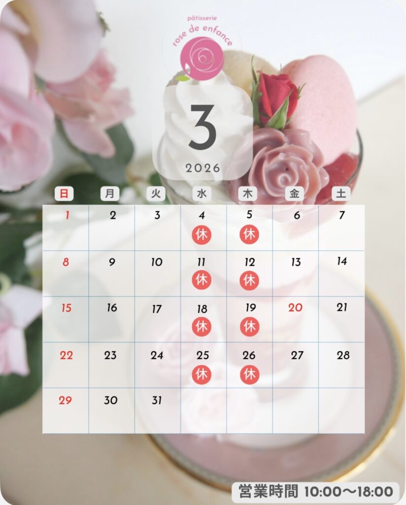3月定休日のお知らせ 2026 2/25 2026年2月25日 お知らせ 2月定休日のお知らせ 関連記事 2月定休日のお知らせ 2026年2月1日 クリスマスケーキの予約受付スタート🎅 2025年11月12日 8月定休日 2025年8月2日 クラウドファンディングの応援メッセージを頂きました🌹 2024年9月22日 Hello world! 2023年6月15日